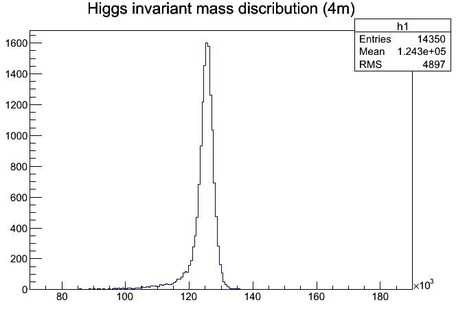 TH1F* h1 =new TH1F(“h1”,“Higgs invariant mass discribution (4m)”,200,70e+3,190e+3);