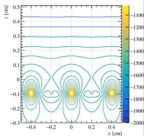 I attach a minimal working example and a snapshot of the potential lines (the lower plate is positioned near Z=-0.1).