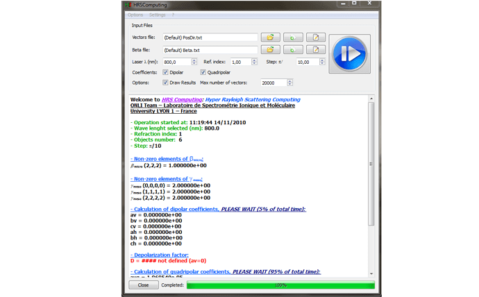 HRS Computing is a scientific software that simulates the “Hyper Rayleigh Scattering” (HRS), which is a nonlinear optics phenomenon. This software was designed for researchers, and it should be a tool that helps them to verify experimental and theoretical hypothesis.