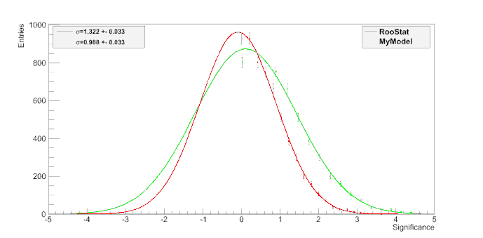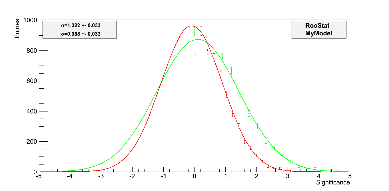 The width of the output of the RooStat routine significance distribution is not compatible with a standard normal gaussian, in contrast to my simple model. However, as far as I understand, the model that is generated in RooStat and the output in RooStat shoud be exactly the same (up to some possible numerical issues which can however not account for the large discrepancies) as my simple likelihood ratio model stated analytically.