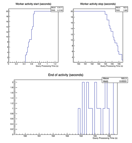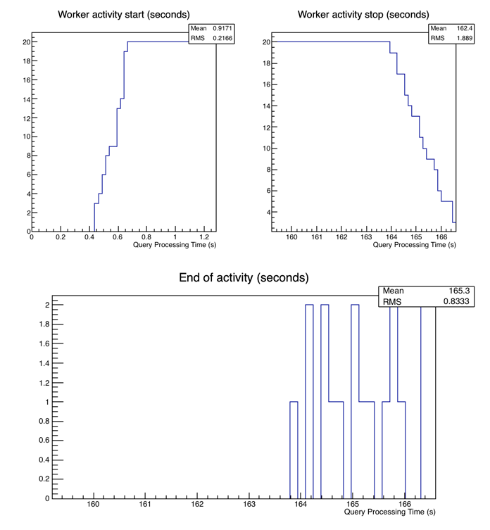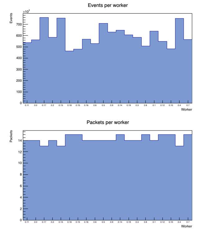 In this run, all 20 workers are working until the end as show in the plot (perf.png; the finishing time has a spread of < 1 s) and each worker gets reasonably the same events and packets (evtdist.png).