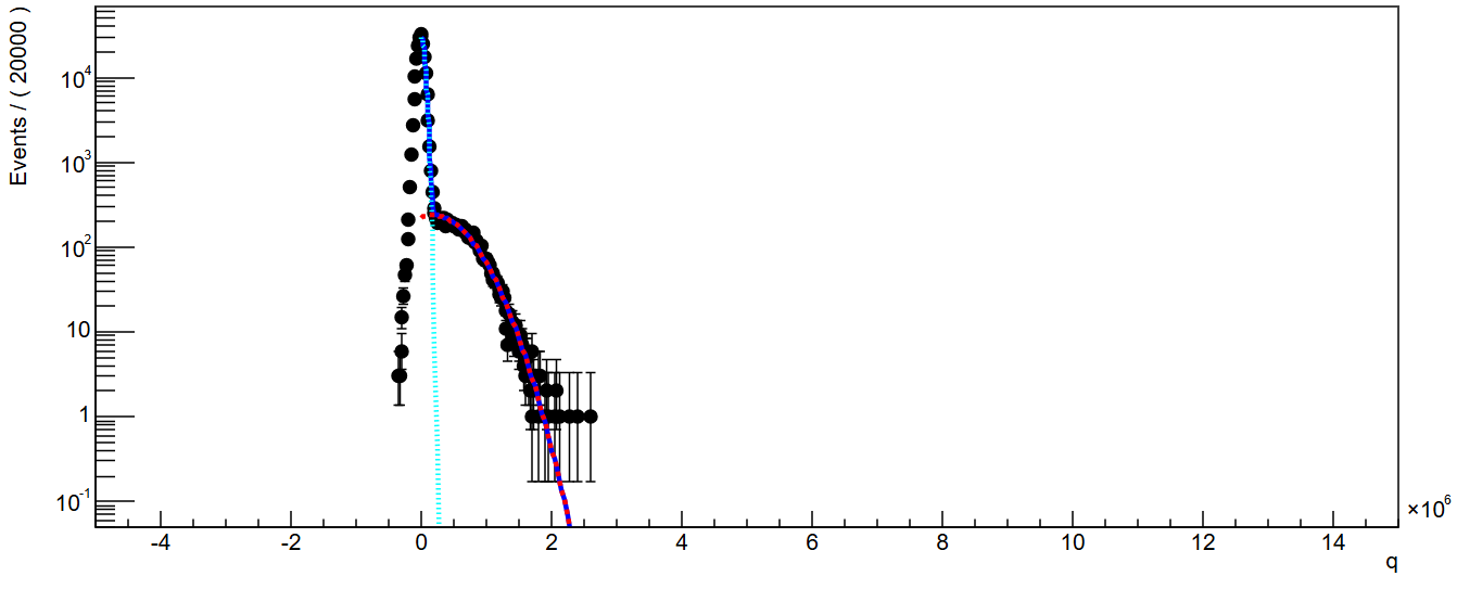 As you see I have no problem to make gauss + gauss, but as soon as I try to model the red component with the Roofit log-normal pdf (which should better describe the physical process in theory), I start to get complains that this component is attempted to be evaluated below zero, even if I restrict the fit to positive value (you notice in the picture that the blue line starts from 1.0 also in the 2 gaussian example).