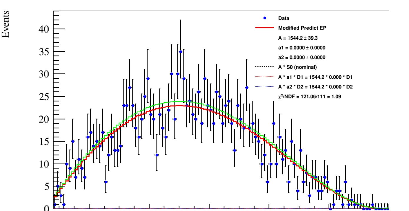 RooHistPdf s0("s0_pdf", "nominal shape", RooArgSet(x), dh_s0); RooDataHist dh_d1("dh_d1", "delta1 shape data", RooArgSet(x), delta1); RooHistFunc d1("d1", "delta1 shape", RooArgSet(x), dh_d1); RooDataHist dh_d2("dh_d2", "delta2 shape data", RooArgSet(x), delta2); RooHistFunc d2("d2", "delta2 shape", RooArgSet(x), dh_d2); RooRealVar A("A", "whole factor", dataIntegral\*0.6, 1000, 2000); RooRealVar a1("a1", "Δ1", 0, 0, 0.01); RooRealVar a2("a2", "Δ2", 0, 0,0.01); a1.setConstant(true); a2.setConstant(true);RooFormulaVar model_val(“model_val”, “s0 + a1*d1 + a2*d2”, RooArgList(s0, a1, d1, a2, d2));