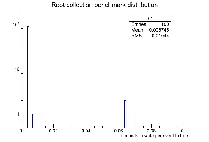 so, I was trying to benchmark root’s latency when collecting data in a standalone application, where the application writes events to a tree (event class is simple, such that it writes time and an array of track data). So it collected about 100 events, where each event had 10000 tracks. I timed how long it took to write each event to the tree. I attached the distribution of those times. So what puzzles me is that there are two peaks, one centered about 0.0047 seconds and the other about 0.064 seconds (granted the latter is a much smaller peak). What I notice though was that the data that contributes to the latter peak occurred after every 30 events written.