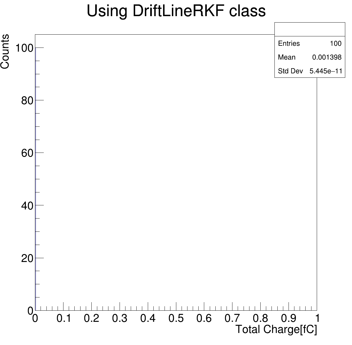 The integrated charge is computed using the gas with pressure of 76. Torr, when changing the charge from negative to positive and filling a TH1D class object, the result is: