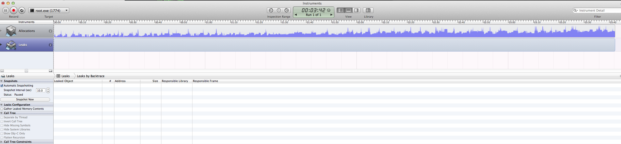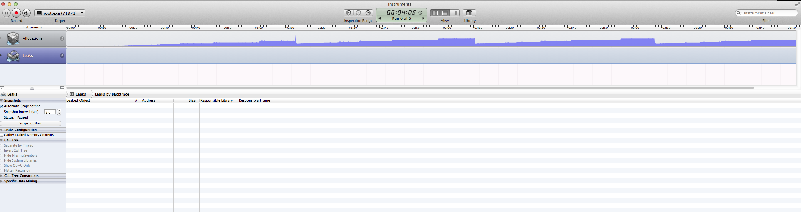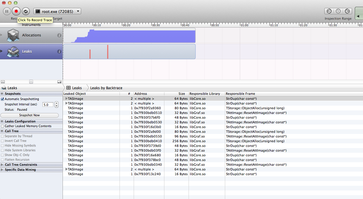 Unfortunately, your code failed to demonstrate a memory leak you’ve mentioned. After I spent some time fixing different errors you have, I was able to run it and attach ‘leaks’ tool from the ‘Instruments’ app to the ROOT’s process. Here’s the screen shot.