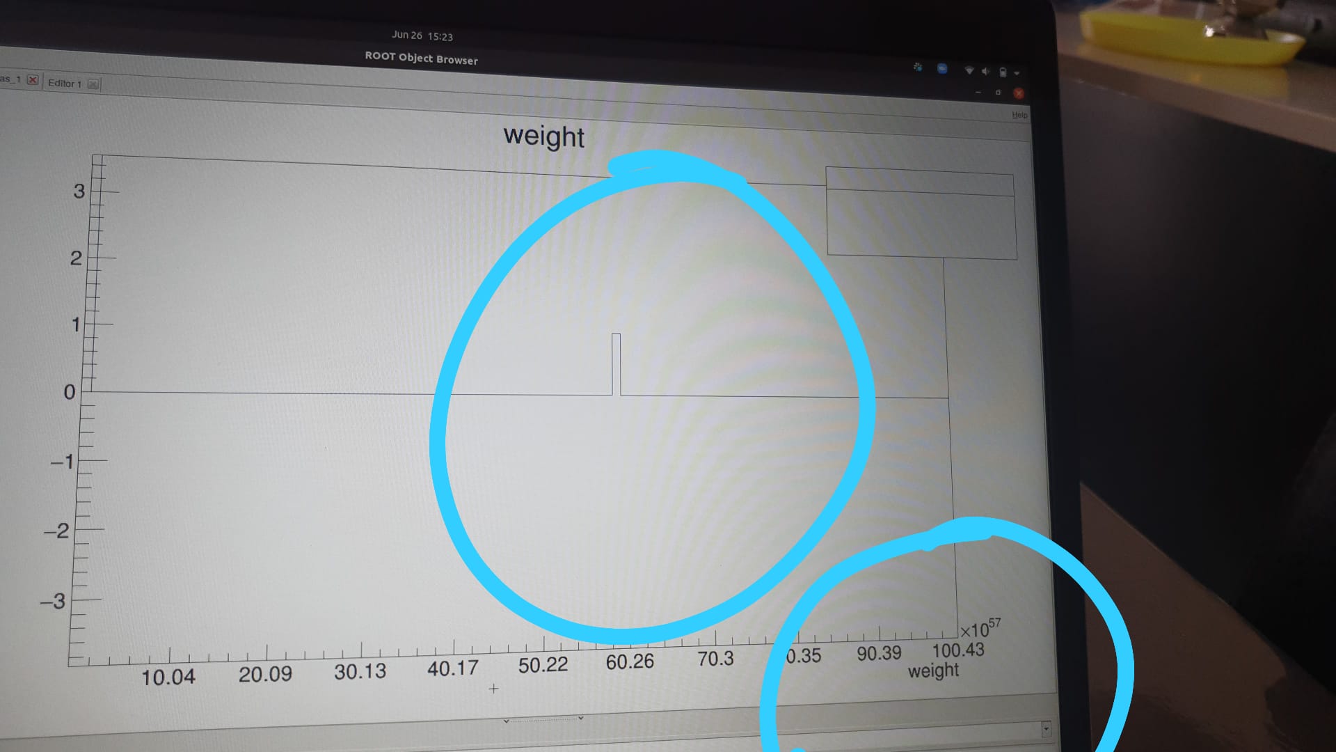 I am a newbie here. I was trying to plot my weight distribution as a tree branch. however I am getting 1 event with really high weight. I cannot understand why and what can i do to fix it. attached please find teh plot. It would be really great if you can guide me with this